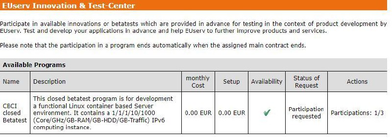 EUServ貌似又有新免费V6小鸡了:打开控制面板,选中任意一个Contract,在左下方找到“Innovation & Test-center”,可以看到一个叫“CBCI closed Betatest”的测试,点击加入即可 过几分钟会有一个新的免费Contract出现,不知道能用多长时间,以前用免费套餐的也可以申请